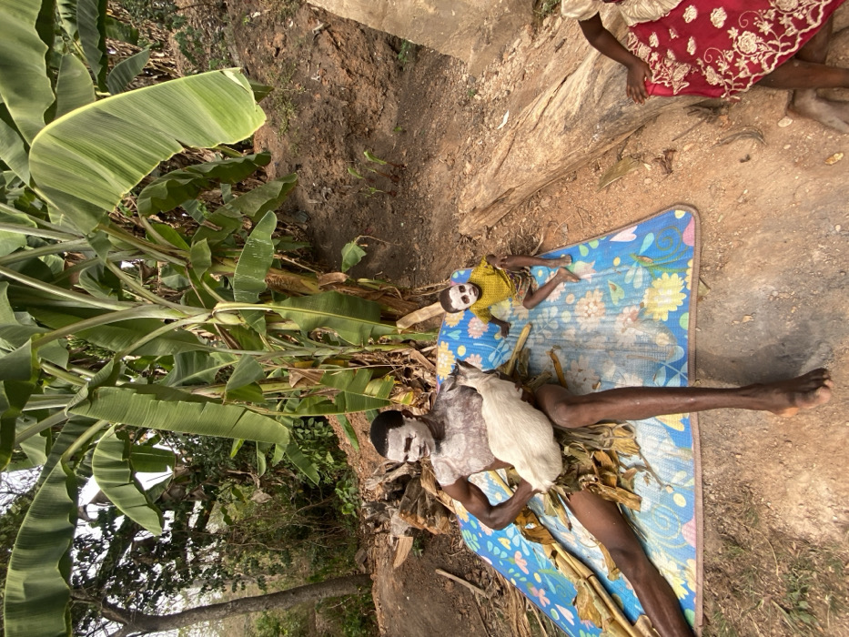 A man with white face paint lies on a floral blue mat outside. He wears a white pelt and a skirt of leaves. A child with matching face paint lies above him. A banana tree arches over them. Nearby, another person is present. The scene appears ritualistic or performance-based. The outdoor setting seems rural and possibly tribal.