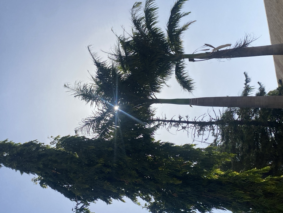The image displays a vertical composition dominated by large trees against a bright, clear sky in Kaduna, Nigeria. A strong sunburst lens flare is visible in the upper-middle section, indicating the sun's position high in the sky, partially obscured by foliage. On the far left, a very tall, slender, dark green tree with dense, cascading leaves extends upwards, filling the left third of the frame. Towards the center and right, two prominent palm trees with thick, light brown trunks stand. The left-most palm's dark green fronds are silhouetted against the sun, through which the bright lens flare originates. This palm appears to have a distinct green band or section on its upper trunk. The right-most palm also features dark green fronds, with some dried frond remnants hanging along its trunk. Between these primary trees, other less defined green foliage and a thinner, partially defoliated tree with dark branches are visible. Along the bottom right edge, a small portion of a light-colored, possibly tiled roof or building structure is present. No people, objects other than natural vegetation and the faint structure, or observable actions/interactions are present in the scene. The environment suggests an outdoor, tropical, or subtropical setting under strong daylight.