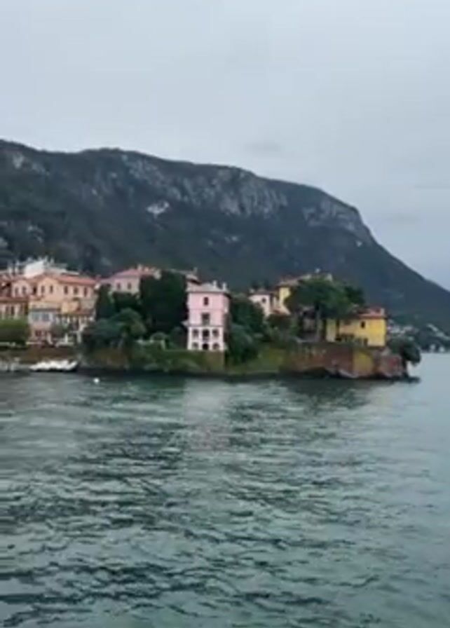 lakeside town with colorful buildings nestled at the foot of a lush green mountain range under a cloudy sky. The camera appears to be on a boat moving along the water, offering a view of the town's waterfront, which features houses in shades of yellow, pink, and orange. A church steeple is visible among the buildings. The water is choppy, and the overall scene evokes a calm, slightly overcast day in a picturesque setting.