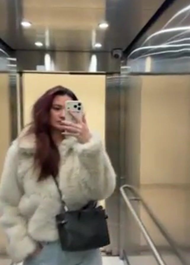 A woman is taking a selfie in an elevator. She is wearing a fuzzy off-white jacket, light blue jeans, and a black purse slung over her shoulder. Her hair is dark with a streak of red. The elevator has mirrored walls and a handrail. The elevator door is visible in the background. The elevator has overhead lights. The woman is holding her phone in front of her face, angled slightly.