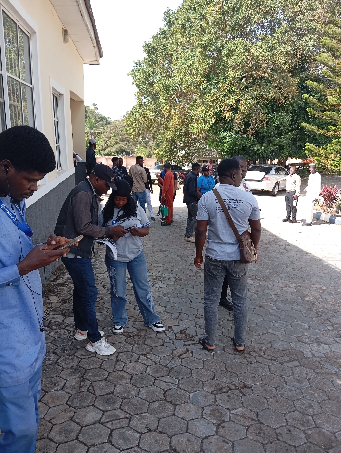This image depicts an outdoor area at a facility in Jos, Nigeria, featuring a light-colored building with multiple white-framed windows on the left and a ground surface paved with grey hexagonal interlocking stones. Large, leafy green trees are prominent in the background and to the right, under bright daylight conditions. Approximately 15 to 20 individuals are present. In the immediate foreground left, a man in a light blue tunic and trousers, wearing black earphones, views a smartphone. Adjacent to him, a man in a dark vest over a long-sleeved shirt and blue jeans, wearing a dark baseball cap, leans over to observe papers held by a woman. The woman, wearing a light grey t-shirt and light blue distressed jeans, holds and examines the papers. Both are focused on these documents. Further into the midground, a man in a grey t-shirt with a brown messenger bag slung over his shoulder stands with his back to the camera. Various other individuals are scattered across the paved area, standing in groups or individually. These include a man in an orange long-sleeved top and another man in white traditional attire in the background right, near a parked light-colored sedan with its trunk partially open. At least one other vehicle is visible behind the crowd.