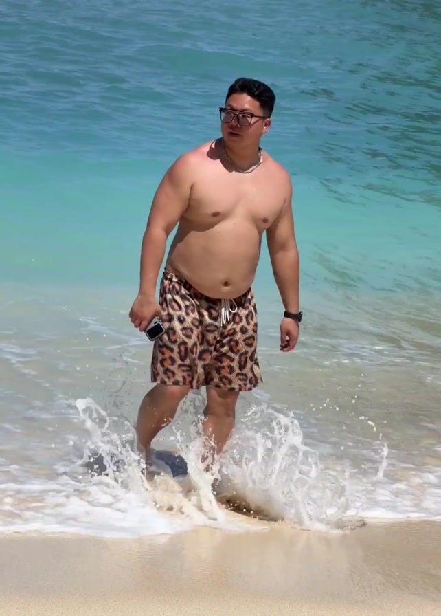 man walking into the ocean at a beach, then stopping and checking his phone. The man is wearing leopard-print swim trunks and glasses. He is of Asian descent with black hair. The ocean water is clear and turquoise, and the sand is light tan. The sky is clear and sunny.