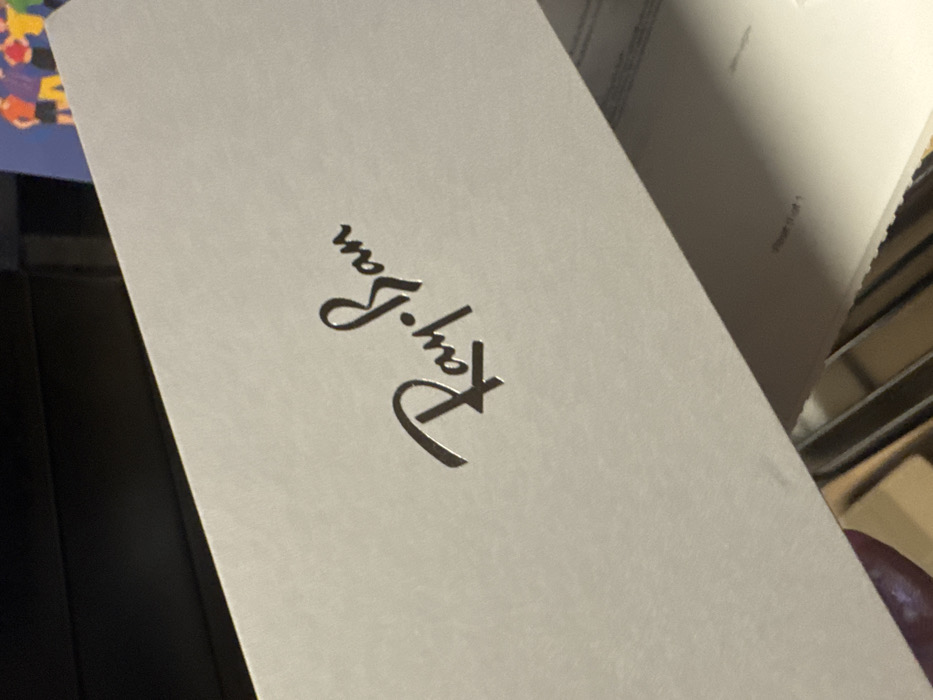 A close-up shows a white box with the Ray-Ban logo printed in black. The logo is diagonally oriented, with "Ray" positioned below and "Ban" above. The surface of the box appears smooth and matte. A stack of white papers, potentially documents or manuals, are partially visible behind the box. A hint of a colorful object, perhaps a book or artwork, can be seen in the upper left corner.