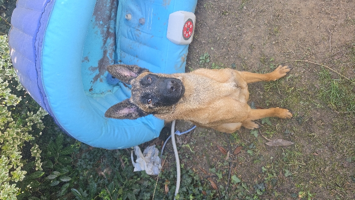 The image displays a fawn-colored dog, consistent with a Belgian Malinois breed, sitting on bare earth interspersed with sparse grass and dry leaves. The dog is positioned centrally, facing directly towards the viewer. Its head, ears, and upper body are coated with light brown sand or fine dirt. The dog's muzzle is black. In the background, to the immediate right of the dog, a large, blue and light blue inflatable object, appearing partially deflated or inverted, rests on the ground. The interior light blue surface of this object contains substantial light brown sandy or muddy residue. Adjacent to the inflatable object, on the ground to the right, is a white, rectangular device with a red circular emblem. To the dog's left, a light-colored hose and a blue cord are visible on the ground near a crumpled white plastic item. Dense green foliage forms the upper left background. The scene is outdoors, indicative of a private garden or yard area. No specific landmarks are present to determine an exact location within Magny-les-Hameaux, France.