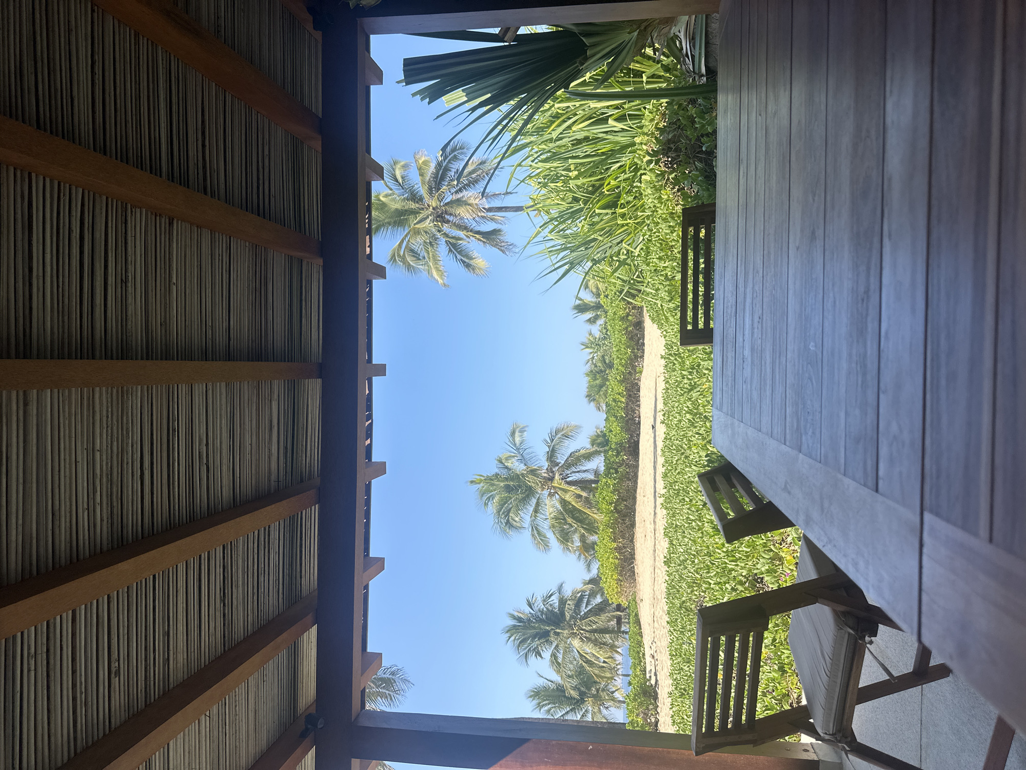 A static outdoor scene is captured from beneath a wooden pergola at Playa Blanca, Mexico