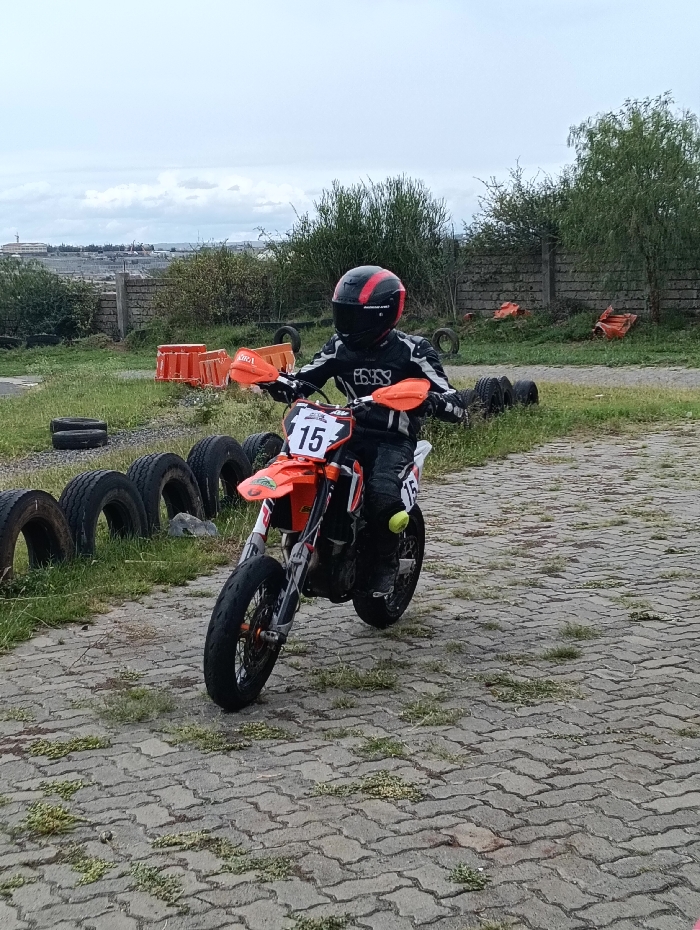- "A single individual, wearing full black and white motorcycle racing gear with red accents, is seated on an orange and black supermoto-style motorcycle" by FM-E8rQG2, licensed under CC BY 4.0