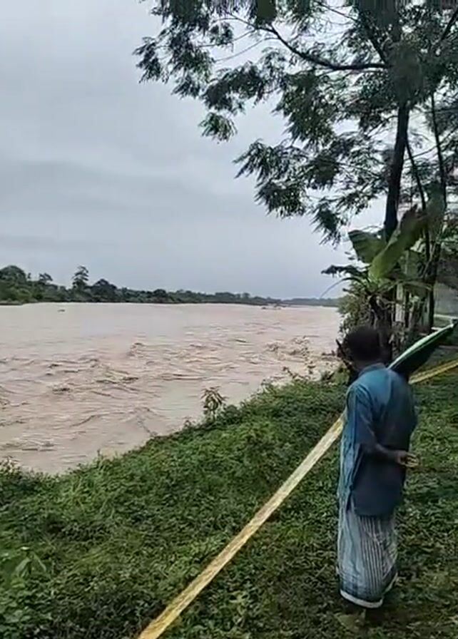 muddy river flowing rapidly. A group of people are standing on the riverbank, watching. The riverbank is grassy with trees. A yellow barrier tape is visible in the foreground. The sky is overcast. Some people have umbrellas. There is a building visible further away on the riverbank.
