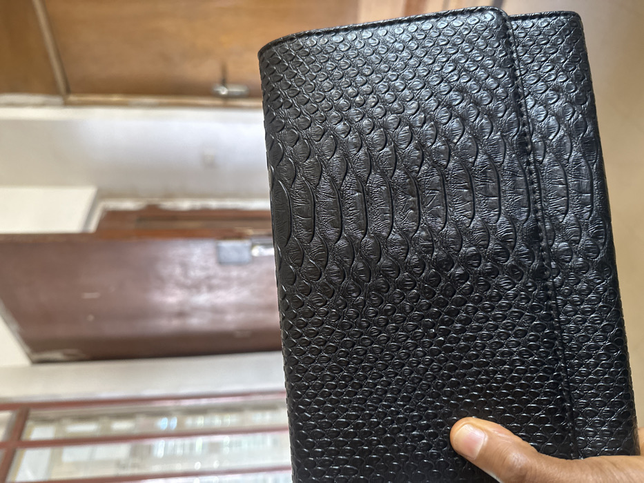 The image presents a close-up, slightly angled view of a black, textured item, resembling a clutch or wallet with a snakeskin or crocodile skin pattern, held by a person's dark-skinned hand, with the thumb visible on the lower-left