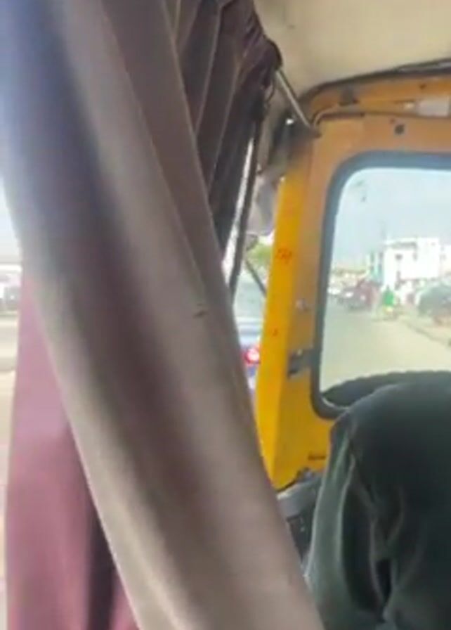 view from inside a yellow auto rickshaw, also known as a keke. The camera is positioned behind the driver, who is wearing a green shirt. Through the front window, a street scene is visible with other vehicles and buildings in the background. As the auto rickshaw moves, the camera pans to the left, briefly showing a gas station with several vehicles parked around the pumps. The camera then returns to its original position, focusing on the interior of the keke and the driver. The lighting suggests it is daytime. The curtains on the left of the frame are a combination of beige and maroon. The overall impression is of a typical ride through a busy street.