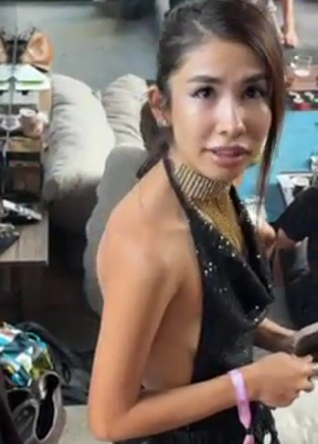 Here's a detailed description of the video: A woman is standing in what appears to be an indoor event space or lounge. She has dark hair pulled back in a unique braid style and is wearing a black, backless dress with a gold choker. She is holding a smartphone or small tablet in her hands. She is interacting with someone off-camera, speaking and smiling briefly. The background shows other people seated on lounge-style furniture, indicating a gathering or social event is taking place. There are various objects like bags, mugs, and other personal items scattered around, suggesting a relaxed atmosphere. The overall lighting is moderate, and the scene seems casual.