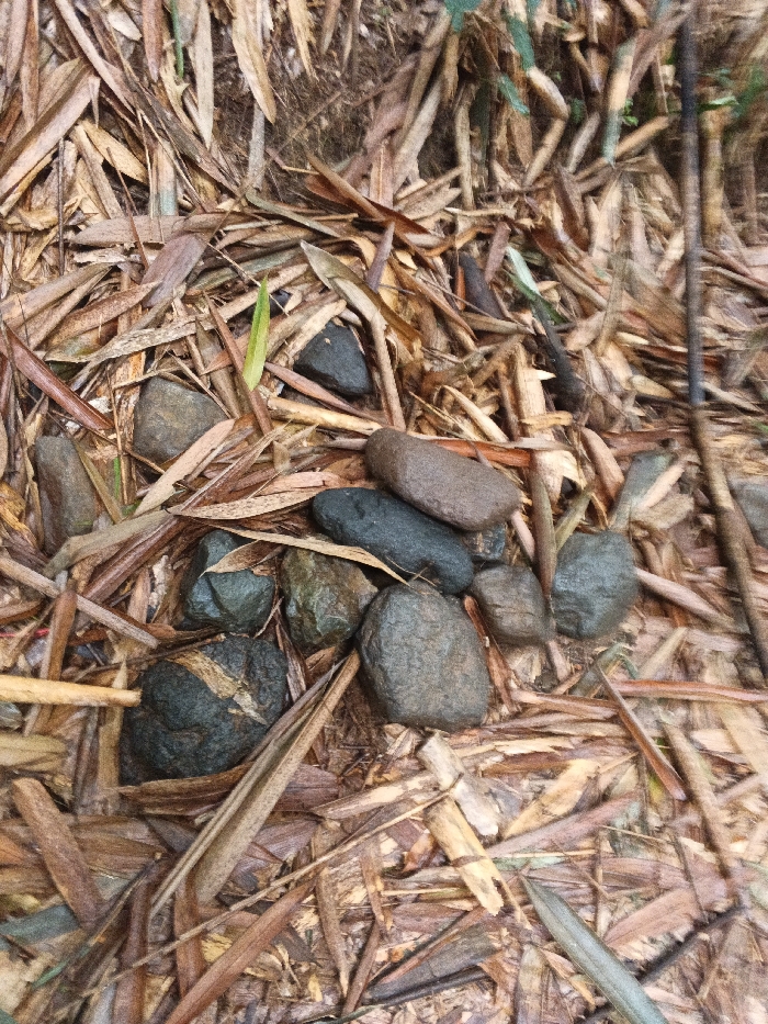 The scene, located on the ground in Situm, Papua New Guinea, depicts a natural outdoor environment. The primary surface is covered by a dense, uneven layer of dried, elongated leaves, consistent with fallen bamboo foliage, displaying various shades of brown and reddish-brown. Among this leaf litter, a single vibrant green sprout is visible in the upper left section of the frame. Clustered towards the center and lower half of the image are approximately fifteen smooth, water-worn stones of varying sizes, ranging from dark gray and black to muted brown. These stones appear damp, with some exhibiting lighter streaks or mottling, and are resting directly upon the bed of dried leaves. No individuals, animals, or man-made objects are present. The lighting is natural and appears diffused.