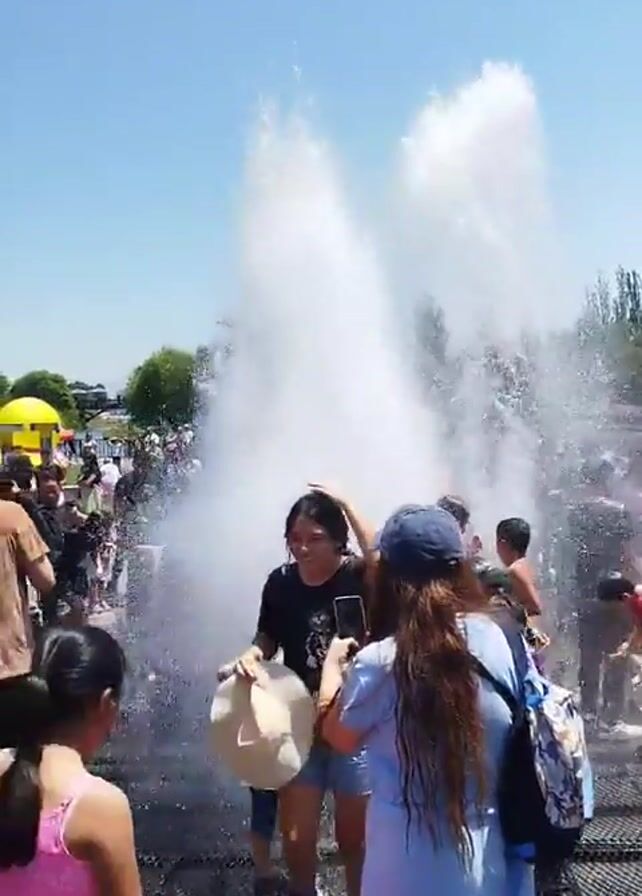 crowd of people, including adults and children, gathered around a water fountain on a sunny day. The fountain has two high streams of water shooting upwards. Some people are getting wet, while others are taking pictures or videos with their phones. The people are diverse in age and ethnicity. The environment appears to be a park or recreational area, with trees and other people visible in the background. Some people are wearing hats and backpacks.