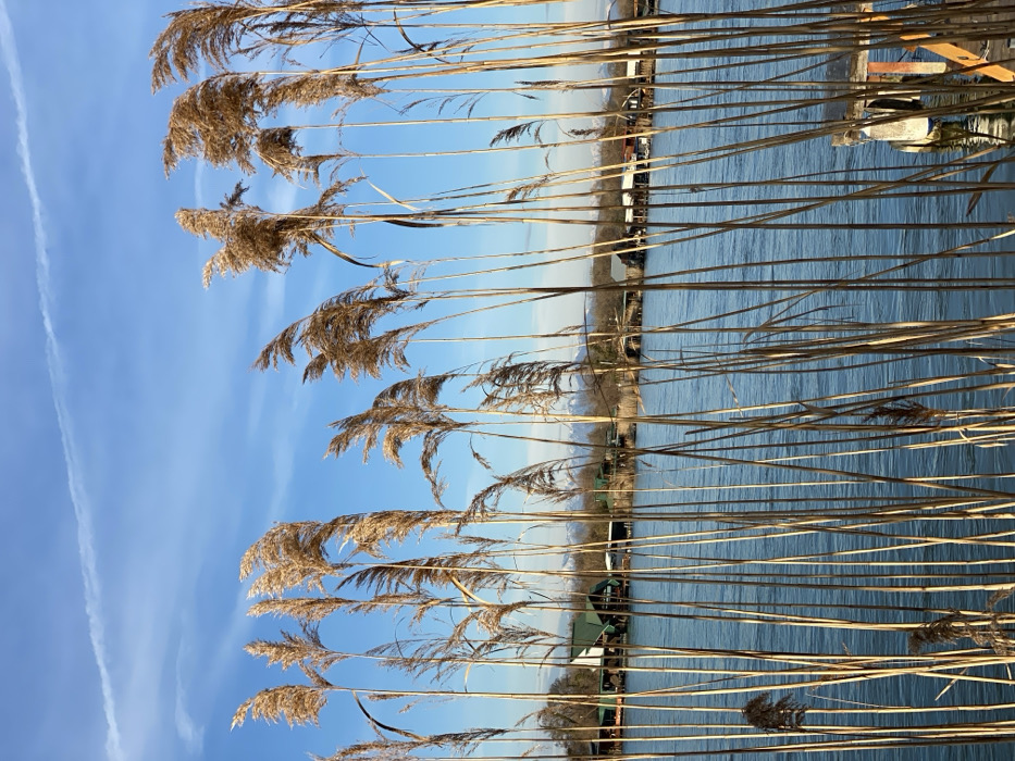 - "Tall, brown reeds dominate the foreground against a bright blue sky with a faint contrail" by FM-gzVUI2, licensed under CC BY 4.0