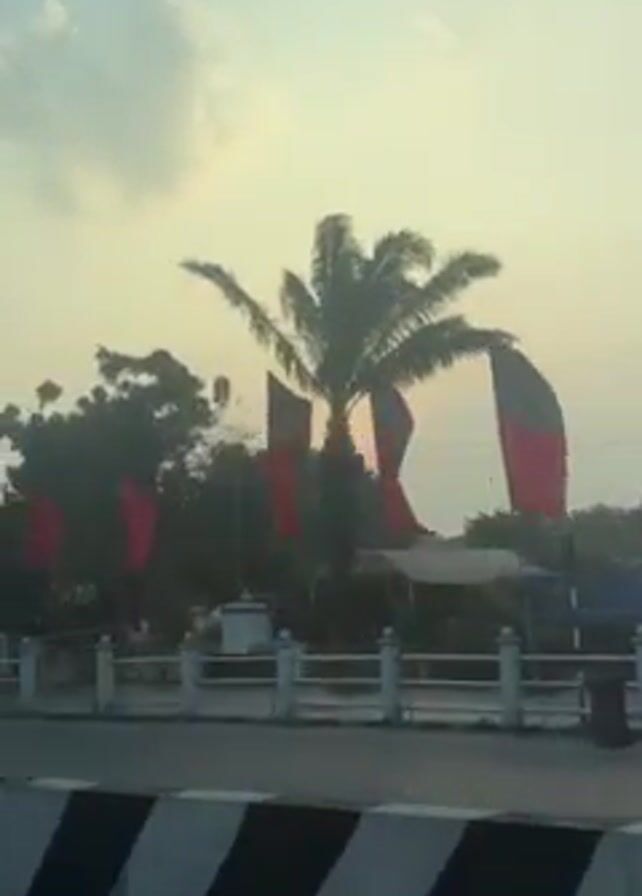 The camera pans from a street corner with palm trees and red and black flags, to a view of traffic and a gas station under a golden sky, presumably at dawn or dusk. The scene includes cars, auto rickshaws, a gas station with cars refueling, and a figure walking on the sidewalk. The sky is cloudy, and the sun is low on the horizon. The camera appears to be inside a vehicle moving slowly along the road.