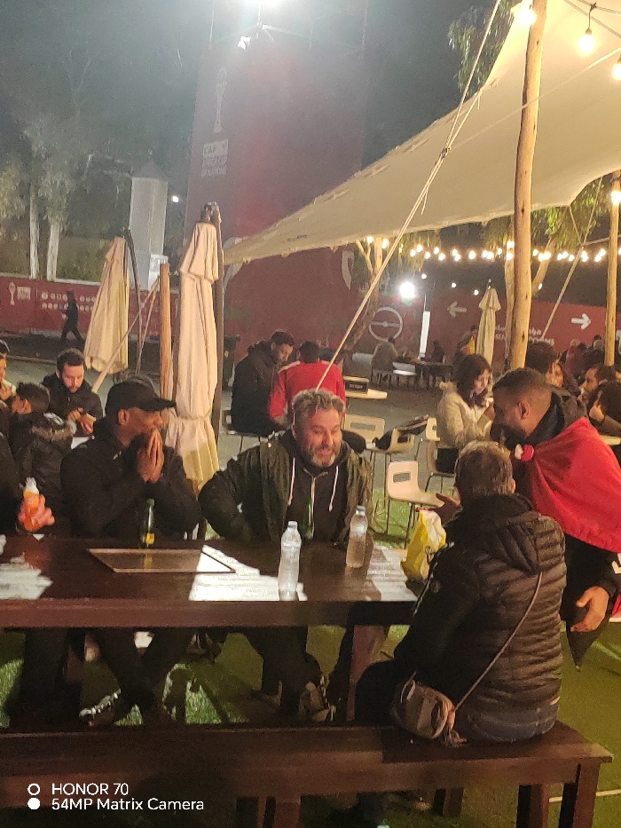 An outdoor evening scene shows people sitting at picnic tables, lit by overhead string lights beneath a white canopy. A red building with "CAF Champions League" printed on it stands in the background. A man in a black jacket and baseball cap sits beside another man with gray hair, near someone wearing a red cape. Bottles of water and beer are on the table. People mill around in the background, some at other tables and some walking around.