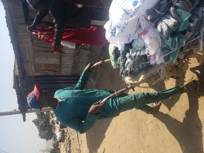 A sunny, wide-angle outdoor shot in Kwamba, Nigeria, depicts a busy, informal urban environment. In the foreground, a young male, wearing a teal tunic and trousers with a red and blue baseball cap worn backward, walks leftward, pushing or pulling a large, heavily laden, makeshift cart. He holds two metal handles connected to the cart, which is piled high with bundles of plastic bags, predominantly black and clear, along with a large white bag featuring partially visible blue text reading "FA PROMISE". His sandals are brown. To his right and slightly behind him, another male, partially obscured, is holding up a red fabric item with gold embroidery. Behind them, a dilapidated structure constructed from corrugated metal sheets serves as a backdrop, suggesting an informal dwelling or market stall. A utility pole with overhead wires is visible to the left of this structure. The ground is a light brown, dusty dirt path. Distant trees and additional rudimentary structures are visible in the background under a clear, bright sky.