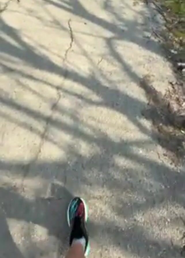 A first-person view video shows someone walking on a cracked asphalt road. The person is wearing white shorts and colorful running shoes. The road is lined with trees casting shadows, and there are buildings visible in the distance. The sky is blue. The video appears to be filmed during the day.