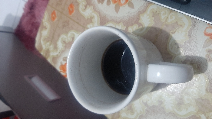 A white ceramic mug containing dark liquid, consistent with coffee, is centered on a light-colored surface featuring an ornamental pattern of orange and brown floral motifs. The mug's handle is oriented towards the viewer's lower left. To the upper left of the mug, a dark, reflective object with a rectangular indentation is visible. A fuzzy, reddish-brown textile material is present in the upper right background. The edge of a black and silver electronic device is partially visible on the far right side of the frame. The scene is static and appears to be indoors in Lhokseumawe, Indonesia.