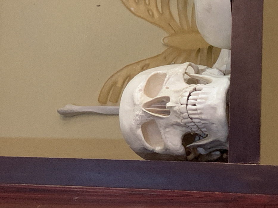 The image displays a white, human skull anatomical model positioned on a dark brown horizontal shelf