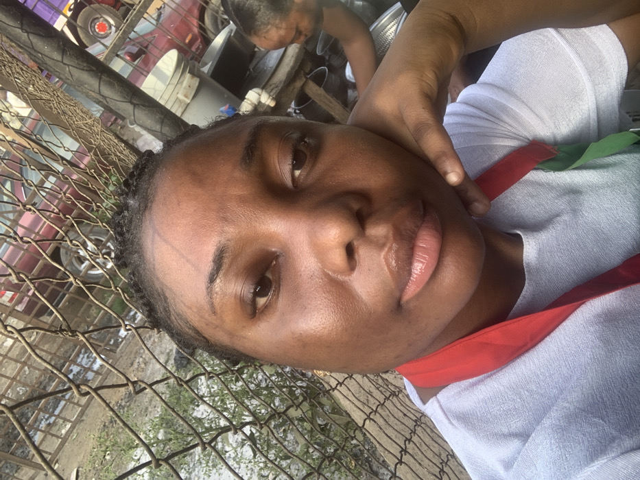 A young woman with smooth, brown skin poses for a selfie. She wears a white shirt with a red and green trim. Her lips are glossy. She rests her cheek against her hand. Behind her, a wire fence is visible, with a blurry background of metal objects and a person. The image is taken at an angle.