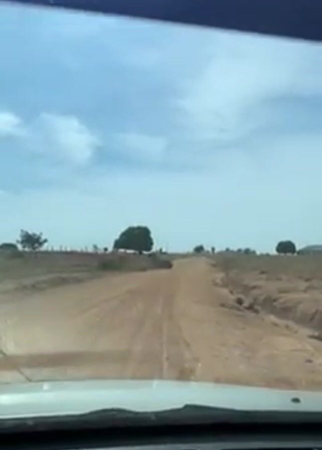 view from inside a vehicle driving on a dirt road. The sky is partly cloudy. The landscape is mostly dry, with some trees scattered in the distance. The camera is static, focusing forward through the windshield. There are no people visible in the video.