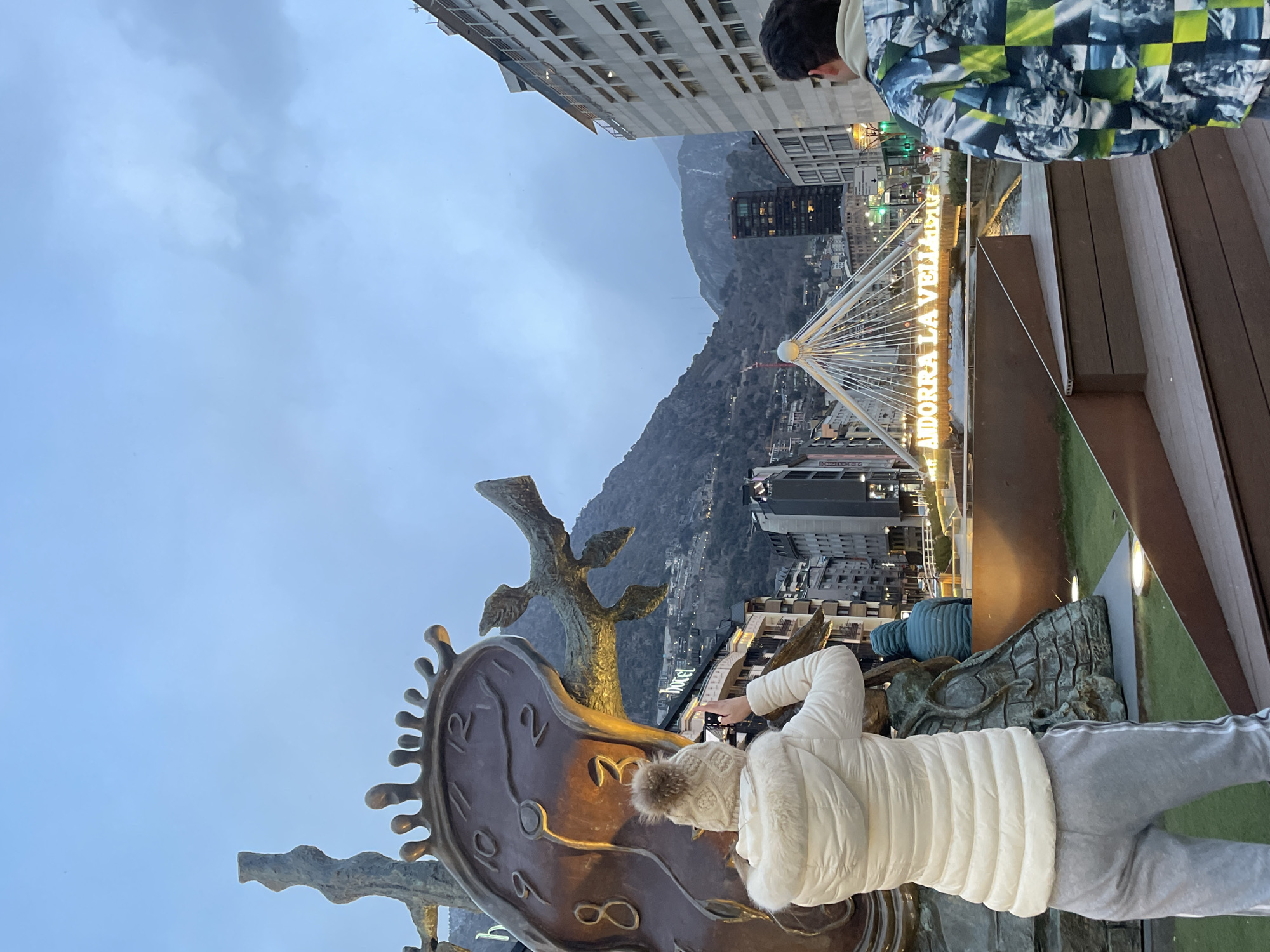 A tilted, outdoor photograph depicts a woman taking a picture of a surreal, melted-clock sculpture. A male figure stands to the right and above the woman. The sculpture is on a raised platform above a street in the city of Andorra la Vella, Andorra. In the background are multiple-story buildings, mountains, and a white suspension bridge that spells out "ANDORRA LA VELLA." The sky is overcast and dull. The woman taking the photo is wearing a white puffer jacket, gray sweatpants, and a knit hat. The sculpture is made of brown metal with gold accents. The man is wearing a patterned blue and green jacket.