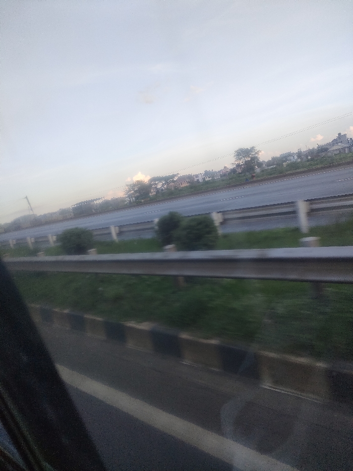 The image depicts an outdoor scene of a multi-lane highway in Kalimoni ward, Kenya, viewed from what appears to be a moving vehicle. The sky, occupying the upper two-thirds of the frame, is a pale, hazy blue-white with faint cloud formations. A distant horizon line reveals a sparse arrangement of trees and numerous buildings, likely residential, bordering the far side of the highway. Above these structures, indistinct utility lines are visible. The midground features a wide, asphalt highway, appearing as a dual carriageway separated by a central median. The median contains scattered green bushes. A metal guardrail runs horizontally across the lower mid-section, appearing somewhat blurred, indicating motion relative to the camera. Another, less distinct barrier runs parallel to it further across the highway. Below the prominent guardrail, a strip of green grass is visible, followed by a concrete curb painted with alternating black and white sections. The immediate foreground, specifically the lower-left corner, is obscured by a dark, out-of-focus object, consistent with a vehicle's window frame or interior. A blurred white line is discernible on a dark surface beneath this obstruction, likely a road marking. No individuals are visible, nor are any specific actions or interactions taking place. The scene is illuminated by diffuse daylight.