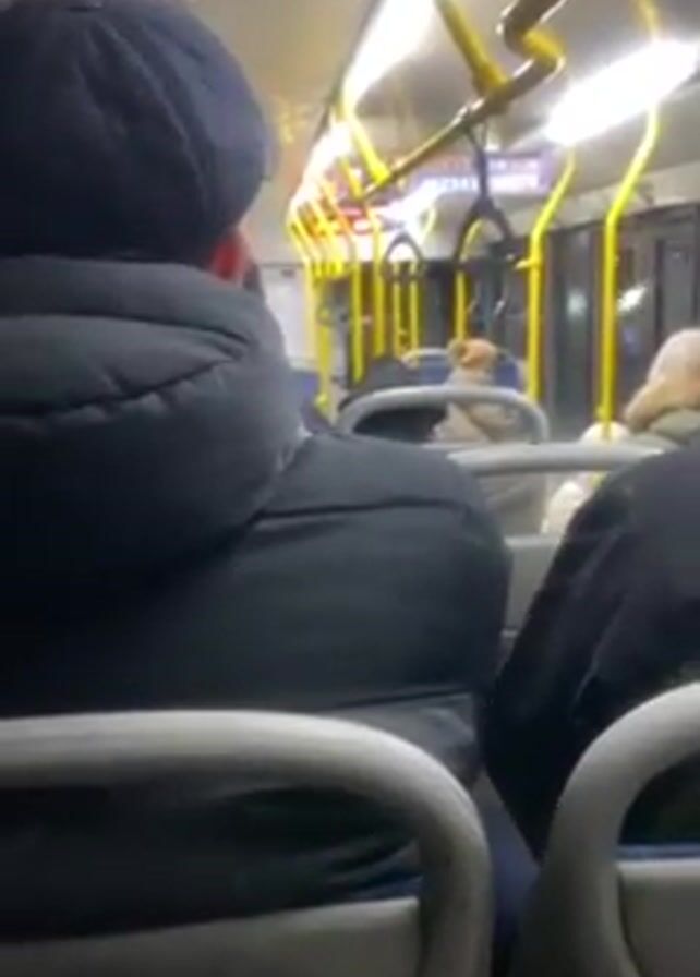 inside of a bus, with several people seated. The camera is positioned behind a person wearing a dark blue jacket and cap. The bus interior has yellow handrails and gray seating. Other passengers are visible further down the aisle. The camera shifts to show a window covered in fog or condensation, with a red light visible outside. The scene appears to be filmed at night or during a time of poor visibility.
