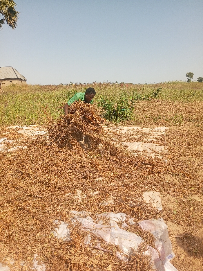 The image depicts an outdoor agricultural setting in Kakau, Nigeria, under a clear, light-blue sky. A male individual, wearing a green short-sleeved shirt, is positioned centrally, bent over, and actively holding a large, dense bundle of dried, light-brown plant stalks or pods. The ground in the foreground is covered with a significant quantity of scattered dried plant material, intermingled with several white plastic sheets or bags laid flat on the dry, light-brown earth. In the background, a field of mixed green and brown vegetation extends towards the horizon. To the distant upper-left, a single-story building with light-colored walls and a dark, gabled roof is visible. A solitary tree stands on the distant right horizon. A segment of a palm frond is visible in the upper-left corner of the frame.