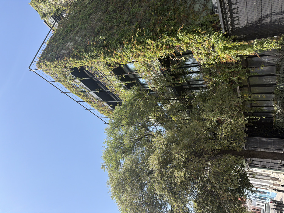 This image depicts an urban street scene in Monterrey, Nuevo León, Mexico, specifically at **Punto Central in Barrio Antiguo**. The primary subject is a multi-story, modern building occupying the right and central portions of the frame, with its facade extensively covered in dense green ivy and climbing vines. The building features dark-framed windows arranged in vertical sections, with several visible balconies or recessed areas also draped in vegetation. A dark metal railing runs along the upper perimeter of the structure. In the left foreground, a large, mature deciduous tree with light green foliage partially obscures the building's lower and mid-sections. To the far left, a street is visible, lined with a row of older, smaller buildings featuring varying pastel-colored facades (blue, white, peach) and traditional architecture. A white vehicle is partially visible, parked on the street. Several dark bollards are present on the sidewalk in the immediate left foreground. A dark metal fence or gate with a patterned design separates the main building from the street level on the right side. The sky above is clear and bright blue, indicating sunny weather. No people or discernible actions are present in the scene.