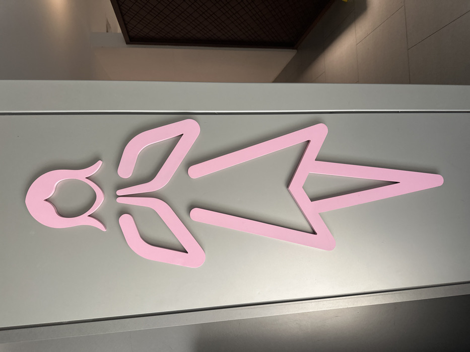 A pink, stylized figure symbolizes a woman's restroom. It's mounted horizontally on a gray surface. The figure comprises a circular head with hair, shoulders, arms, and a triangular skirt/dress pointing towards the right. The design is minimalist and modern. It appears to be a sign indicating the location of a female restroom.