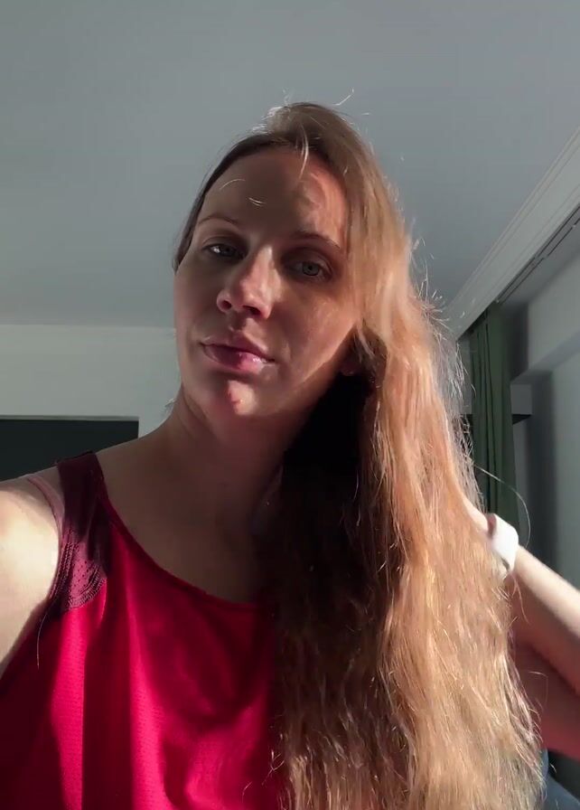 A fair-skinned woman stands indoors, illuminated by sunlight, and plays with her long, light brown hair. She is wearing a red tank top with dark maroon trim. The room appears to be sparsely furnished and painted white. She faces the camera before turning to look towards the window.