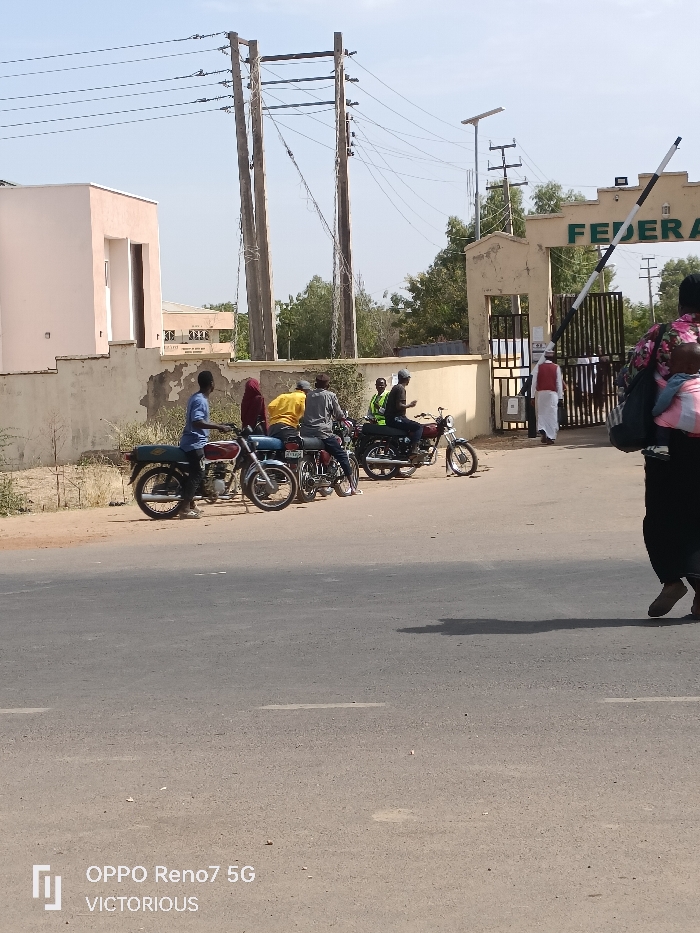 This image depicts an outdoor street scene in Dutse, Nigeria, under a clear, pale blue sky. The foreground is dominated by a grey asphalt road featuring faint white dashed lane markings. A prominent, elongated dark shadow stretches across the lower right portion of the road. On the far right, a person dressed in dark clothing and brown shoes is walking leftward, away from the viewer, carrying a baby secured to their back in a colorful wrap. In the midground, a low, light-colored concrete wall extends from the left to the right. To the far left, behind this wall, stands a light peach-colored building with a brown, recessed doorway. Along the dirt shoulder adjacent to the wall, five motorcycles are positioned. Multiple individuals are present: a man in a blue shirt is seated on a dark motorcycle on the left; a person in a reddish-brown garment stands near another motorcycle; a man in a yellow shirt and cap is on a motorcycle; a man in a grey shirt and cap is on a fourth motorcycle; and two individuals in dark attire are on a fifth motorcycle further right. To the right, a large, light-colored architectural gate structure is visible, featuring a prominent, partially visible green inscription reading "FEDERAL A" across its top. A black and white striped boom barrier is angled upwards and to the right, indicating an open or elevated position. A person dressed in a white robe and white cap is seen walking towards the gate's pedestrian entrance. Above the gate and extending across the upper midground, several tall wooden utility poles with multiple overhead power lines are present. A solar-powered street light is mounted near the gate. The background features sparse green foliage and indistinct distant structures.