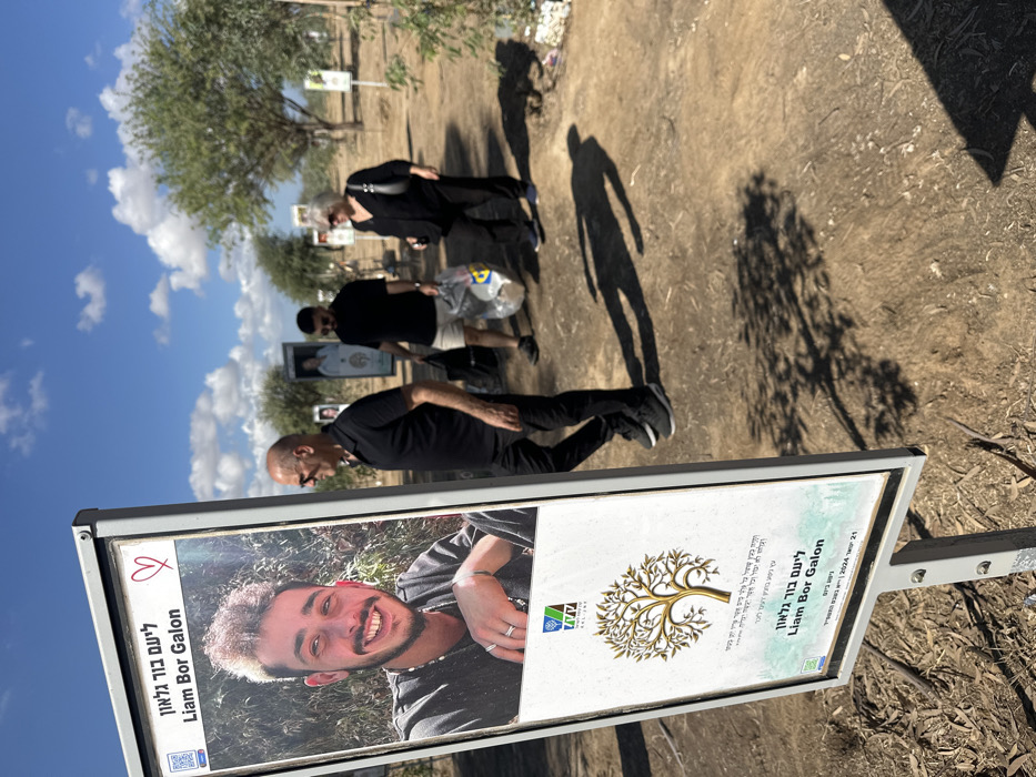 An outdoor scene depicts a memorial site under a clear blue sky with scattered white clouds. The location is within the Eshkol Regional Council, Israel, identified as a memorial area, likely the "Forest of the Missing." In the immediate foreground, a metallic gray vertical sign displays a color photograph of a young man, Liam Bor Galon, who is smiling. The sign includes his name in both Hebrew and English, a QR code, a red heart symbol, and below the photo, a logo featuring an olive tree illustration, and additional Hebrew text with the date "21 נובמבר 2023" (November 21, 2023). Three individuals are walking from left to right on a light brown dirt path in the midground. The leftmost person is an older male, bald, wearing sunglasses, a black short-sleeved shirt, black pants, and dark sneakers. The middle person is a younger male with dark hair, wearing a black t-shirt, light-colored shorts, and dark shoes; he carries a black bag in his left hand and a clear plastic bag containing white items in his right. The rightmost person is an older female with gray hair, wearing a black v-neck top, black pants, and dark shoes, carrying a dark shoulder bag. All three cast long shadows to their right, indicating bright sunlight. The background shows a vast expanse of similar memorial signs, each with a photograph, dispersed across the arid landscape. Numerous sparse green trees are scattered throughout the area. The ground consists of dry, light brown soil and dirt.