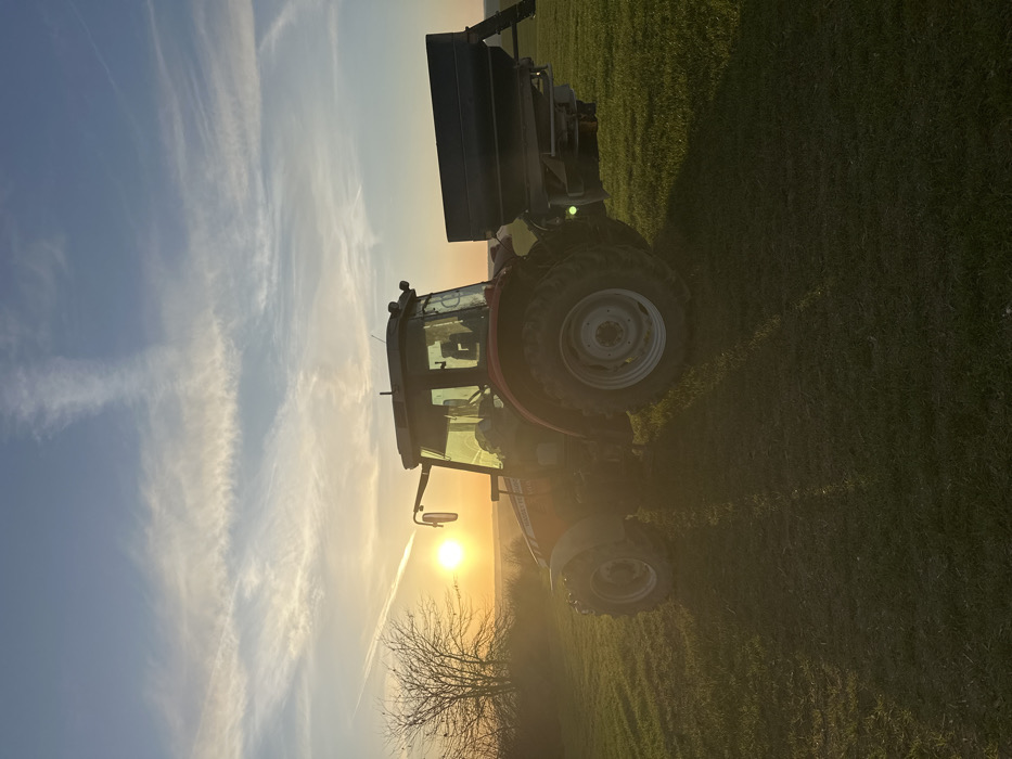 The image displays an agricultural field in Cherven, Bulgaria, during sunset. A red Massey Ferguson tractor, facing slightly left, is positioned in the middle-right of the frame, stationary on green crop growth. Attached to its rear is a black farm implement, appearing to be a fertilizer spreader, with a circular green light visible on its lower rear section. No individuals are discernible within the tractor's cab or elsewhere in the scene. The low sun, a bright golden-orange orb, is situated on the left horizon, partially obscured by a bare, multi-branched deciduous tree silhouetted against it. The sky transitions from a golden-yellow hue near the horizon to light blue, then to a deeper blue at the top, featuring scattered white, wispy clouds. Long shadows are cast from the tractor across the foreground.