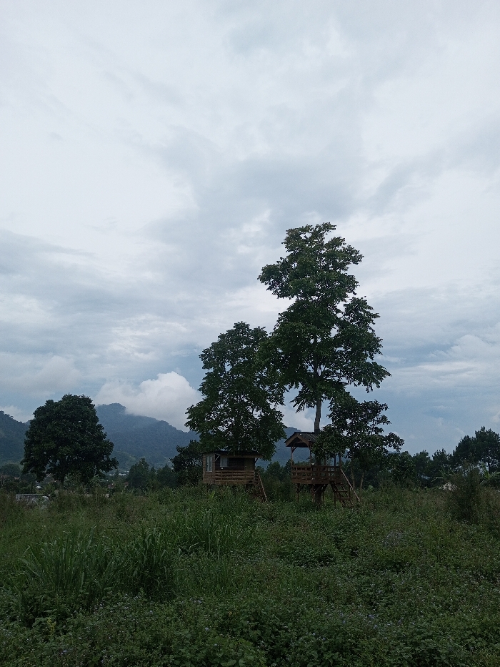 The image depicts a rural landscape in Abbireddygudem, India, under a heavily overcast sky. The foreground is densely covered with overgrown green vegetation, appearing as wild grasses and varied flora. In the midground, two large deciduous trees with full, dark green foliage stand prominently. The tree on the left features an elevated, enclosed wooden structure resembling a small hut, complete with a visible window and a diagonal wooden access ramp. The taller tree on the right supports an elevated, open-sided wooden platform equipped with a railing and an attached multi-step wooden staircase. The background reveals a range of green, vegetated mountains, partially obscured by white clouds and mist that cling to their slopes. Faint indications of distant structures, consistent with a small settlement, are discernible at the base of these mountains. No individuals, actions, or direct interactions are observed within the frame.