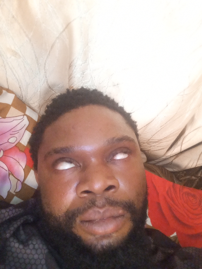 A male individual with dark skin, a full dark beard, and short dark hair is depicted in a close-up, high-angle shot. His eyes are rolled upwards, exposing the white sclera entirely, with irises and pupils obscured. His mouth is slightly open. He is wearing a dark garment featuring a subtle hexagonal pattern on the left side. The background includes a patterned pillow with a prominent pink floral design and brown checkered elements to the left, a light-colored fabric with an embossed pattern behind his head, and a bunched red fabric on the right. The scene is located in Narayi, Nigeria.
