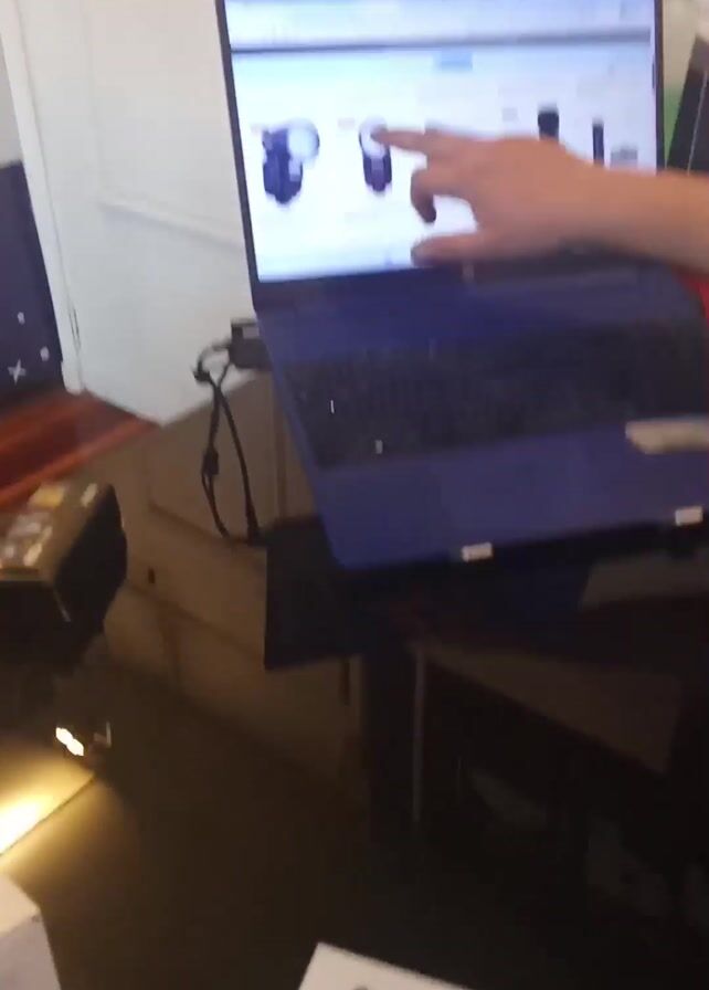 Here's a detailed description of the video: The video begins with a close-up of a blue laptop on a black glass table. The laptop screen displays a webpage with images of camera flashes. A hand points at the images on the screen. The camera pans slightly to show more of the table's surface, which includes a white paper cup, a red coaster, a stainless steel thermos, and a picture frame on a shelf. The camera angle shifts to include more of the person standing next to the table. They are wearing a black shirt and a pink wristwatch. They are standing to the right of the laptop. The background shows a white door and light-colored walls. The lighting in the room seems to be a mix of natural and artificial light. The focus remains primarily on the laptop screen and the person's hand gesturing towards it.