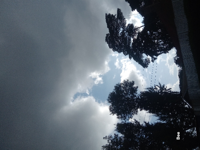 This is an outdoor photographic image, captured from a low-angle perspective, depicting a landscape against a partially overcast sky in Nyeri, Kenya. The upper two-thirds of the frame are occupied by a sky dominated by dark, heavy clouds, with a central, irregular patch of brighter blue sky visible, interspersed with white cumulus clouds. Multiple tall trees are silhouetted in dark tones across the mid-ground, obscuring their specific species or detailed foliage. A prominent tree with a broad, sprawling canopy is situated on the right, while other slender, conical trees are visible to the left and center. Several thin, dark lines, resembling overhead utility wires, traverse horizontally through the mid-ground, partially intersecting the tree silhouettes. In the lower portion of the image, a horizontal structure resembling a corrugated metal fence or wall is present. The faint outline of a building's roof is discernible above this structure on the left. No individuals or animals are visible, and no actions or interactions are depicted. The white text "Bee" is present in the lower-left corner of the image.