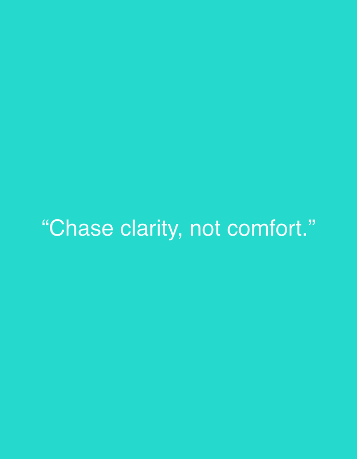 The image showcases a turquoise background with a quote centered on the screen. The quote reads, "Chase clarity, not comfort." The font is white and simple, ensuring readability against the bright background. The overall design is minimalistic, drawing focus to the message itself. The simplicity and color palette lend a clean and modern aesthetic to the image.