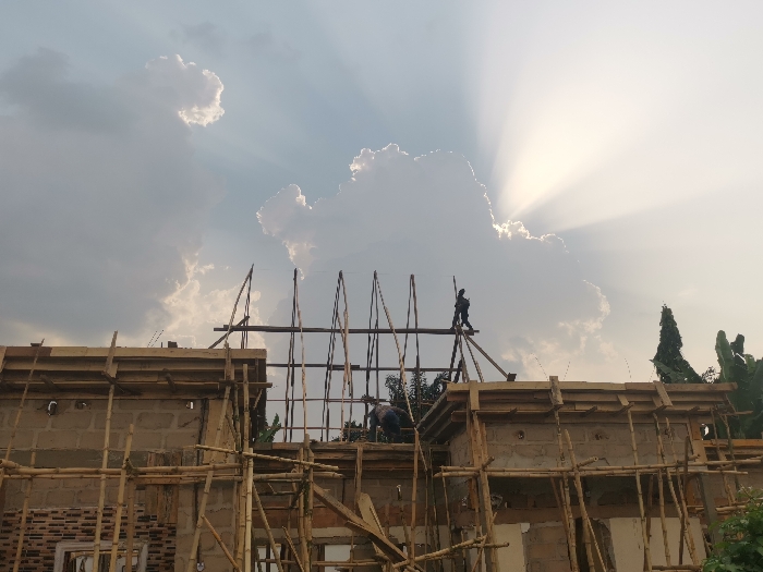 A partially constructed building is silhouetted against a cloudy sky with rays of sunlight peeking through. Bamboo scaffolding surrounds the building. Two figures are visible: one on the roof structure and another at a lower level, both appearing to be construction workers. The building's unfinished brickwork and wooden framework are prominently displayed.