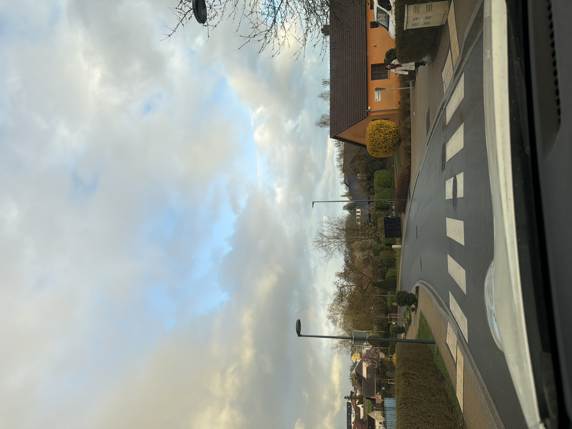 street scene in Junglinster, Luxembourg, taken from inside a vehicle. The street curves to the right and features a pedestrian crossing. A person in a white coat stands on the sidewalk next to an orange building. Streetlights are visible along the road. The sky is cloudy with patches of blue. Houses and trees line the street.