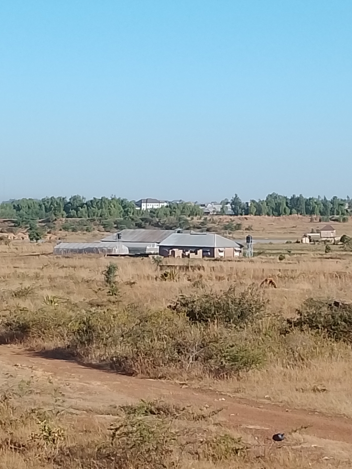 A rural landscape under a clear blue sky showcases a cluster of buildings. These include structures with pitched roofs and what appears to be greenhouses. The foreground features dry, grassy terrain with scattered bushes and a dirt path. Distant trees line the horizon, punctuated by a few more buildings. The overall scene suggests a remote agricultural area.