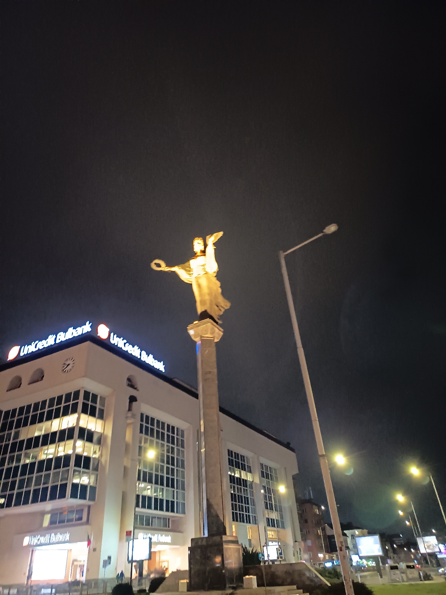 The scene depicts the Saint Sofia Monument at night in Sveta Nedelya Square, Sofia, Bulgaria. A prominent golden-colored statue of a winged female figure, holding a laurel wreath in her extended left hand and with her right arm raised, stands on a tall, light-colored column, which rests on a multi-tiered dark stone pedestal. The statue and pedestal are centrally located and illuminated. To the left, a multi-story building with a light-colored facade and numerous rectangular windows displays multiple illuminated "UniCredit Bulbank" signs in red and white lettering on its upper portion and at ground level. A large circular clock is visible on the building's facade below the upper signs. Several tall streetlights with glowing fixtures are present, primarily to the right of the monument, casting light across the urban environment. The sky is dark, indicating nighttime conditions. In the distant background to the right, other illuminated buildings, streetlights, and commercial signs are visible along a street, suggesting an active city area. No specific individuals are clearly discernible.