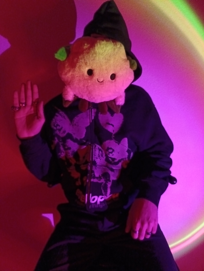 The image displays a single individual from the waist up, situated indoors against a plain wall illuminated by strong pink and purple artificial lighting. A partial rainbow-colored light arc is visible on the right side of the background. The person's head is entirely obscured by a dark hood, beneath which a light-colored, spherical plush toy with a simple embroidered smiling face, two green leaf-like appendages, and several brown root-like extensions is positioned. The individual wears a dark, zippered hoodie adorned with multiple stylized butterfly or moth graphics in purple and pink tones, along with partially visible text on the lower front. Dark trousers or track pants are visible below the hoodie. The subject's left hand (viewer's right) is raised with the palm facing forward, fingers slightly splayed, and multiple rings are visible on its fingers. The right hand (viewer's left) rests by the side, also displaying rings. No specific details within the image allow for the identification of a location in Toulouse, France.