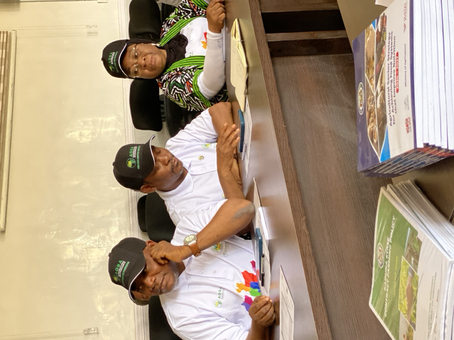 Three individuals are seated at a dark brown wooden conference table in a meeting room located in Shaba, Nigeria. All three subjects wear black baseball caps and white polo shirts, each bearing the AGRA logo and the text "ALLIANCE FOR A GREEN REVOLUTION IN AFRICA." The leftmost individual is a male with a dark complexion, wearing a brown leather-strap watch on his left wrist. His left arm is bent, with his hand resting near his jawline, as he gazes towards the upper left, off-camera. The middle individual, a male, looks down at the table with both hands resting flat. A smartphone is positioned near his right hand. The rightmost individual, a female wearing glasses, presents in a patterned multi-colored jacket over her white polo and a green head covering. She looks straight ahead, hands resting on the table. An open, yellow-paged notebook lies directly before her. A second smartphone is visible on the table between the two male subjects. In the blurred foreground, two prominent stacks of documents are present: one with a green cover titled "KADUNA STATE CONTRACT FARMING POLICY August 2020," and another with a purple/blue cover titled "Agricultural Sector Strategy for Achieving Food Systems that Improve Nutrition 2020 - 2027" from the Ministry of Agriculture. The background consists of a light-colored wall, with a segment of white horizontal blinds visible at the upper right. Black office chairs are partially visible behind the individuals.