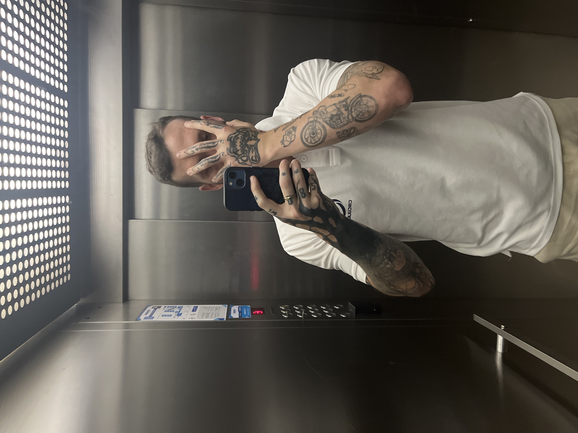 A man is taking a selfie in an elevator. The man has tattoos on his arms and hands. He is wearing a white shirt and beige pants. The elevator has stainless steel walls and a row of buttons. There are documents in a plastic sheet next to the buttons. A grid of lights is visible on one wall. The elevator is located in the city of Cordoba, Argentina.