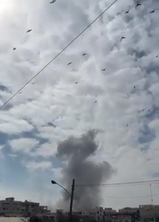 The video depicts a daytime scene with a cloudy sky. In the distance, a column of grey smoke rises above buildings. Numerous birds fly across the sky. There are power lines visible at the top of the frame. A street with a streetlight and parked car are visible in the foreground.