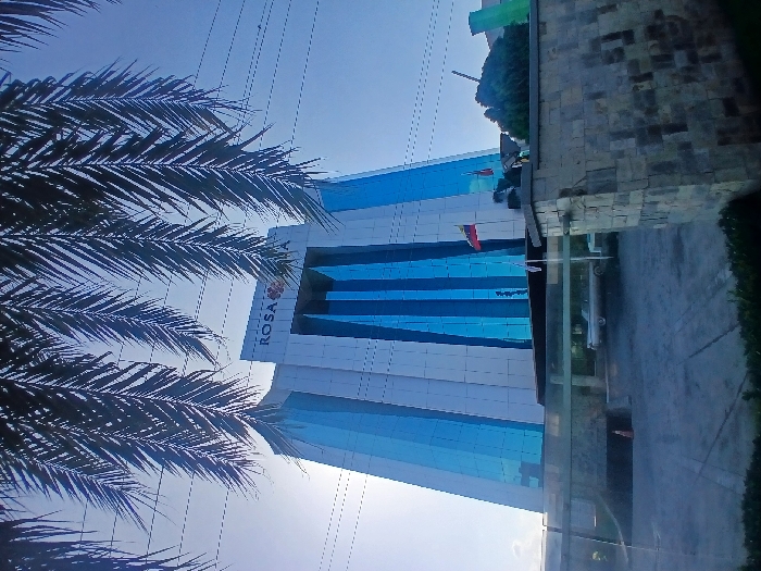 A tall, modern building with a blue glass facade dominates the scene. The word "ROSA" is vertically oriented on the building. Palm trees frame the left side of the image, casting shadows on the scene. A parking area with a single car is visible. The sky is clear and bright blue, suggesting a sunny day. Power lines stretch across the upper portion of the image. A green area is seen on the right side.