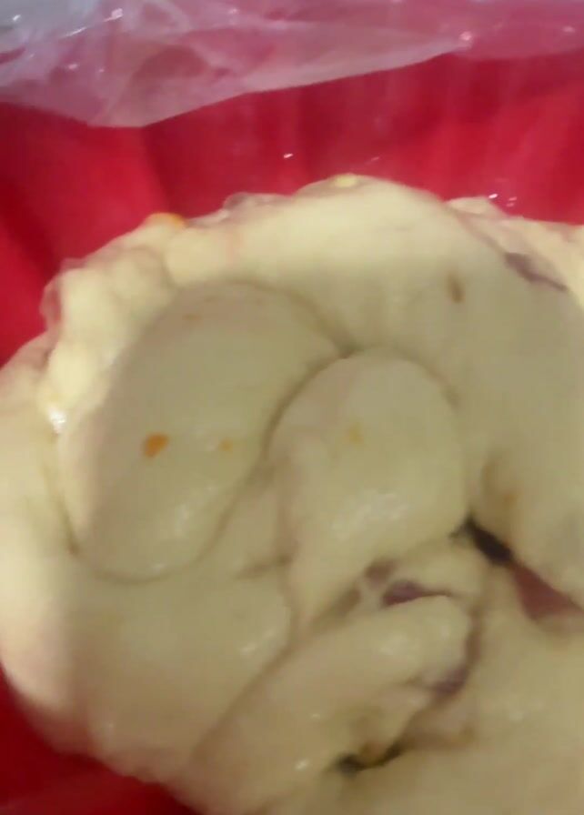 A close-up shot shows dough in a red, flower-shaped mold. The dough is light yellow and appears to contain small pieces of red and orange ingredients. A clear plastic bag partially covers the dough and mold. The mold rests on a dark, speckled countertop in what appears to be a kitchen setting.